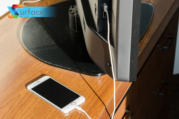 Đôi khi đi du lịch sang một nước nào đó có ổ cắm điện khác với loại bạn thường dùng, điều này sẽ gây khó khăn nếu bạn muốn sạc điện thoại. Đừng lo, hãy tiến đến chiếc tivi đặt trong phòng khách sạn, nhìn ra phía sau hoặc cạnh bên hông của nó sẽ có cổng USB. Lúc này chúng ta chỉ việc dùng sợi cáp kết nối vào là có thể sạc được smartphone rồi đấy.