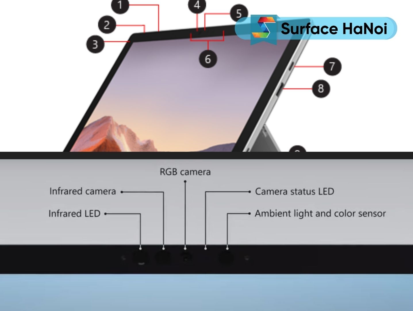 Nhìn chung, các cổng kết nối của thiết bị Pro 7 và Pro 8 không khác biệt nhau quá nhiều. Chúng đều bao gồm các cổng kết nối USB-C, jack tai nghe 3.5mm, Surface Connect Port. Điểm khác biệt lớn nhất giữa hai thiết bị là sự vắng mặt của cổng USB-1, thay vào đó trang bị thêm cổng kết nối Thunderbolt 4.0 trên chiếc Surface 8 Pro.