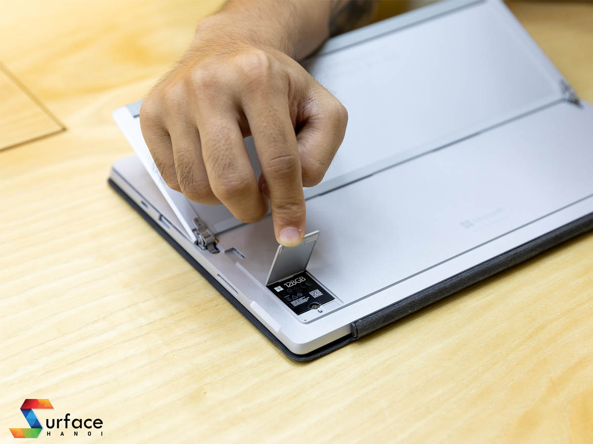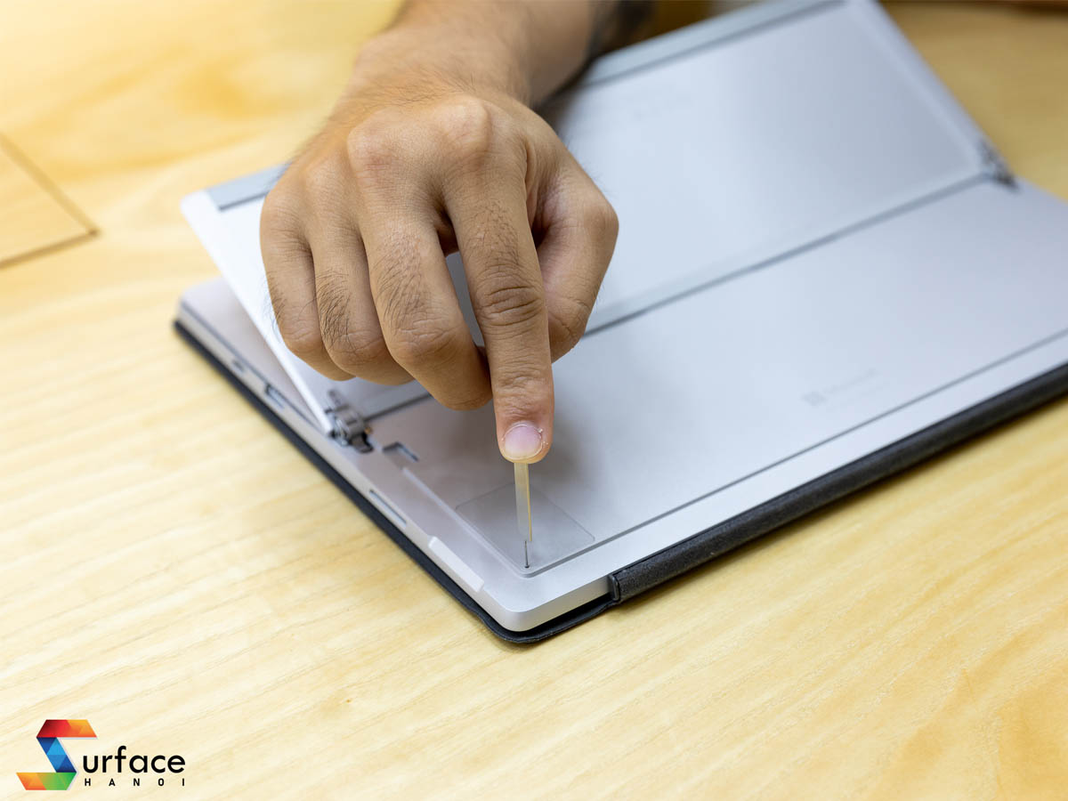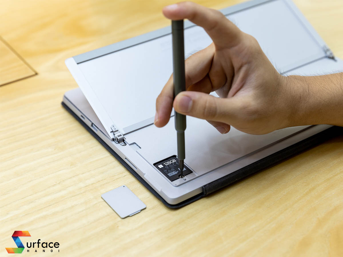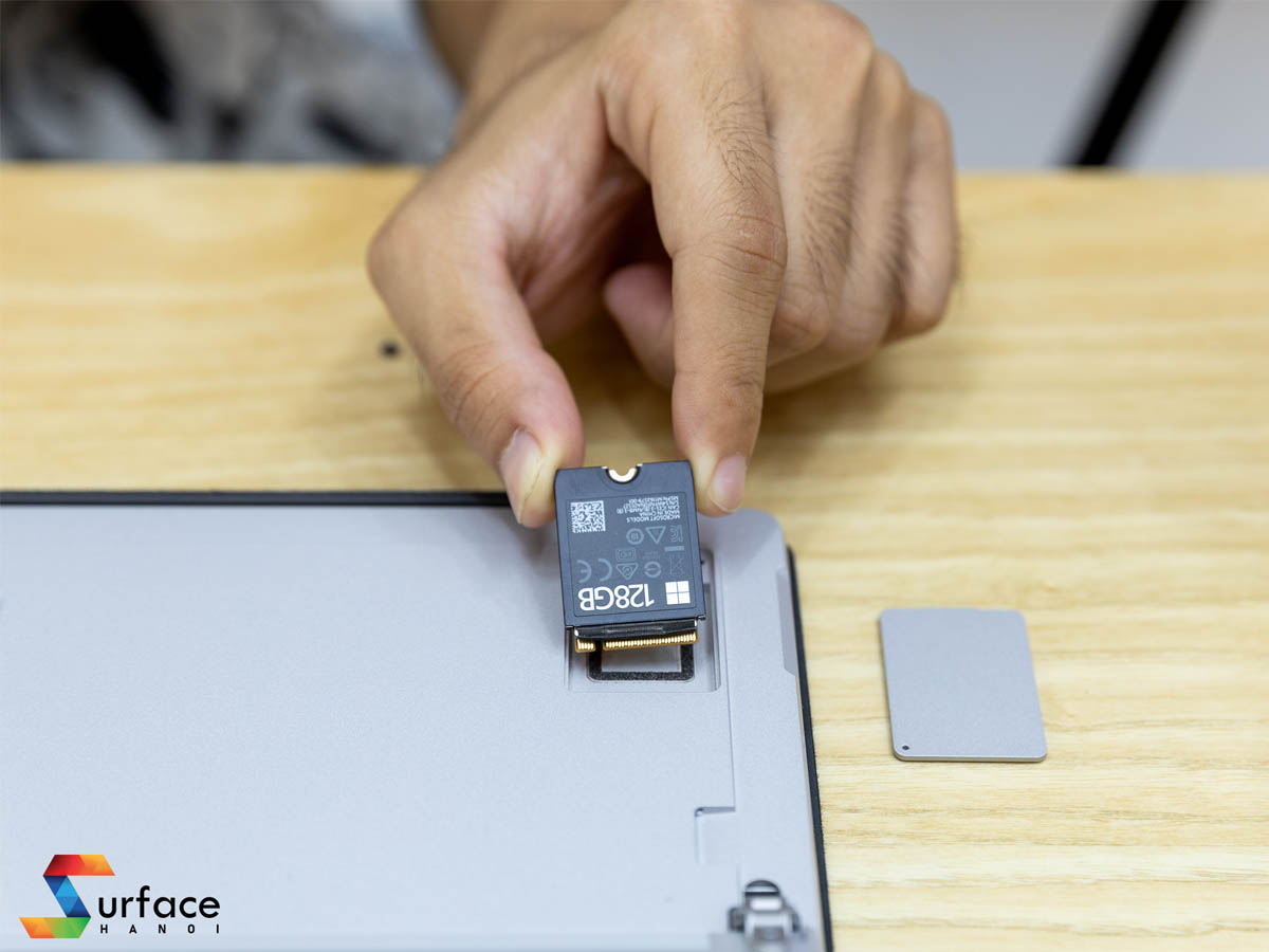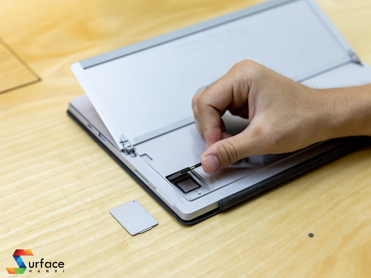 Một trong hai tính năng nâng cấp mới của Surface Pro 7 Plus đó là khả năng tháo rời SSD. Bộ nhớ SSD nằm ở ngay mặt sau máy và người dùng có thể tự thay thế một cách dễ dàng. Chỉ cần dùng que chọc sim tháo phần nắp đậy ra sau đó dùng dụng cụ tháo con ốc ra là được.