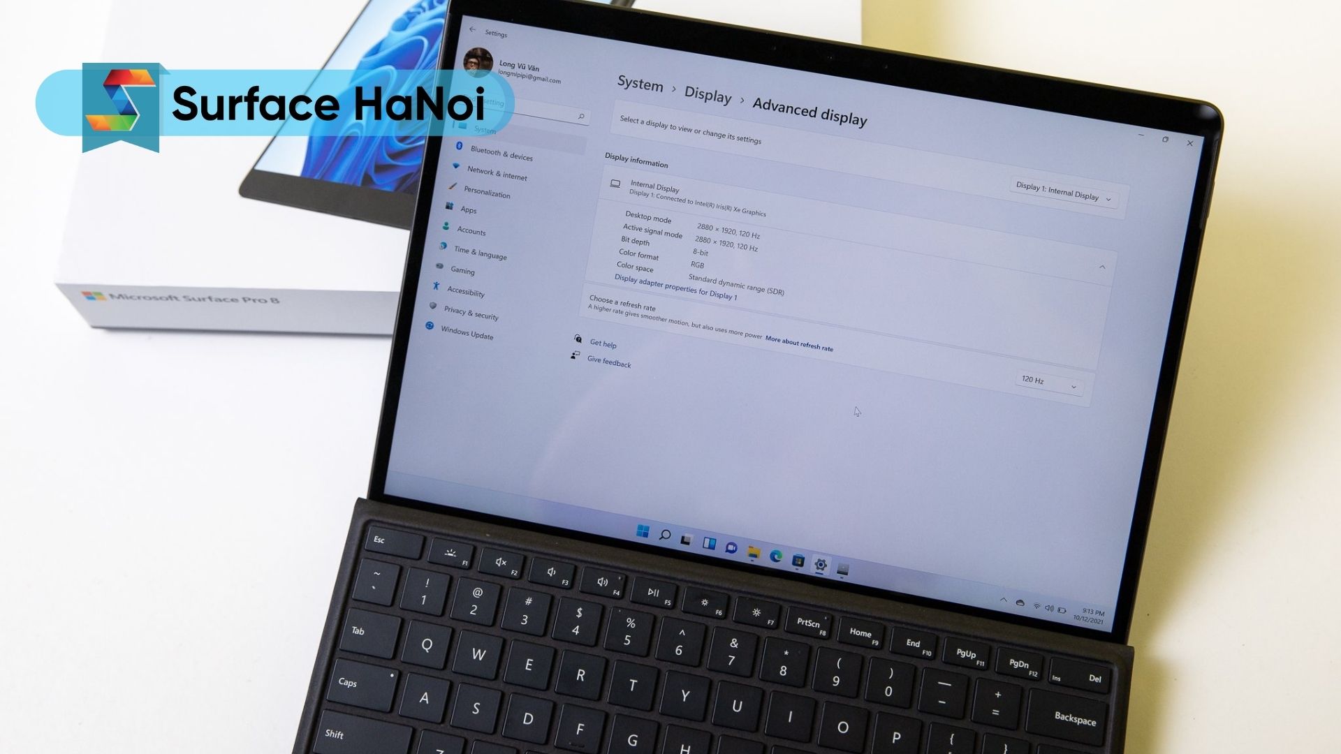 Về độ chuẩn màu, Surface Pro 8 là một trong những chiếc máy có độ chuẩn màu cao nhất trong tất cả các dòng Surface. Lên tới 104% dải sRGB, 81% AdobeRGB và 83% DCI-P3, thực sự vượt trội hơn hẳn những sản phẩm tiền nhiệm. Độ sáng của máy cũng đạt mức tối đa 453%, tối thiểu là 1,9nits, phân bổ sáng 91%, giúp máy không bị lóa khi làm việc ngoài trời cũng như bảo vệ sức khỏe mắt của người dùng. Thêm vào đó, chiếc Pro 8 còn được tích hợp tính năng Dolby Vision, cho hiển thị màu chính xác và sống động hơn.
