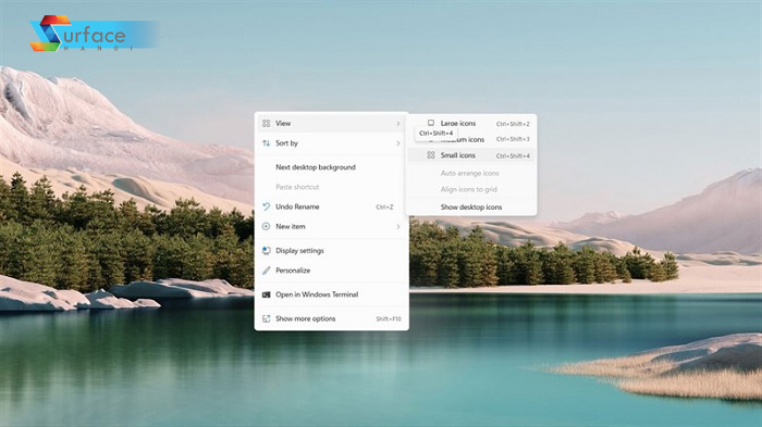 Sau khi cập nhật lên Windows 11, bạn có thể tùy chỉnh kích thước các biểu tượng (icon) trên màn hình máy tính mà không cần phải tùy chỉnh cả hệ thống. Rất đơn giản, bạn chỉ cần chuột phải lên màn hình chính sau đó chọn kích thước mình muốn. Tại đây có 3 tùy chọn gồm: Small, Medium và Large.